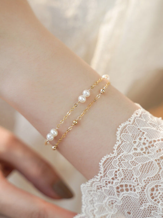 Dainty Pearl Bracelet, Gold Vermeil Fresh Water Pearl Bracelet, Double Chain Bracelet, Minimalist Bracelet, Birthday/Bridesmaid Gift, GB11